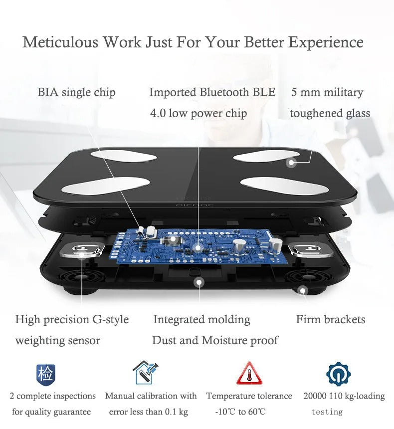 Zahvaljujući ugrađenom Bluetooth modulu, ova digitalna vaga omogućava detaljna mjerenja tjelesne težine, izračunavanje **BMI**-ja, kao i mjerenje procenta masti, vode u tijelu, mase kostiju i mišića. Aplikacija takođe pruža preporuke za dnevnu kalorijsku potrebu.
