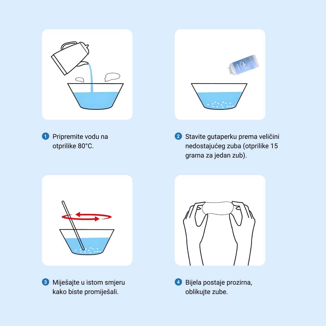 Zub napravljen ovim kompletom je privremen, ali može trajati do 6 mjeseci, što je dovoljno za posebne prilike kao što su zabave, vjenčanja ili intervjui za posao. Za trajno rješenje, preporučujemo posjetu stomatologu.